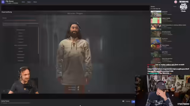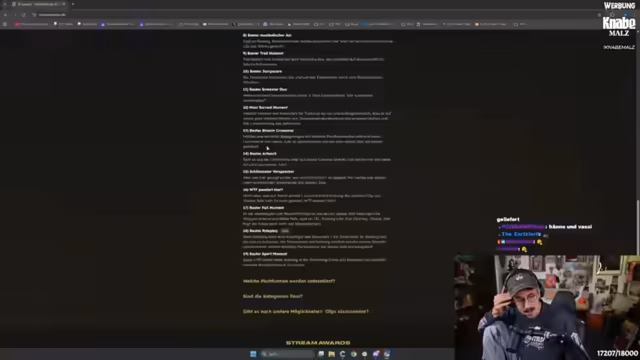01:25:15Der Streamer überlegt, welche Momente aus seinem eigenen Streamverlauf für die Awards eingereicht werden könnten. Er sieht gute Chancen in den Kategorien 'Bester IRL-Moment', z.B. von der Zockerbustour oder dem Techno-Event, und 'Beste Zuschauerinteraktion' durch die langlebige Chat-Diskussion über die Definition von 'Eierlecken'. Auch den 'Bester Jumpscare' aus einem Horror-Spiel und das 'Beste Stream Crossover' mit dem Besuch von Robert Habeck nennt er als vielversprechende Kandidaten.