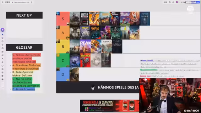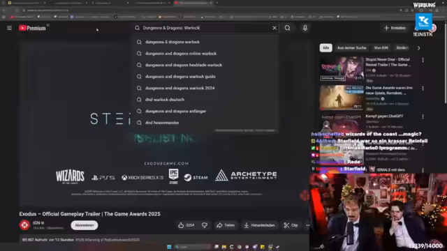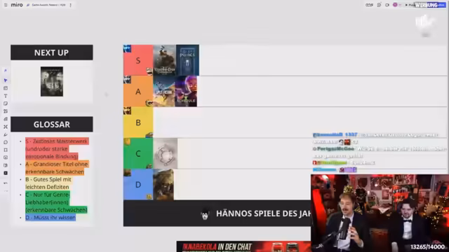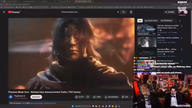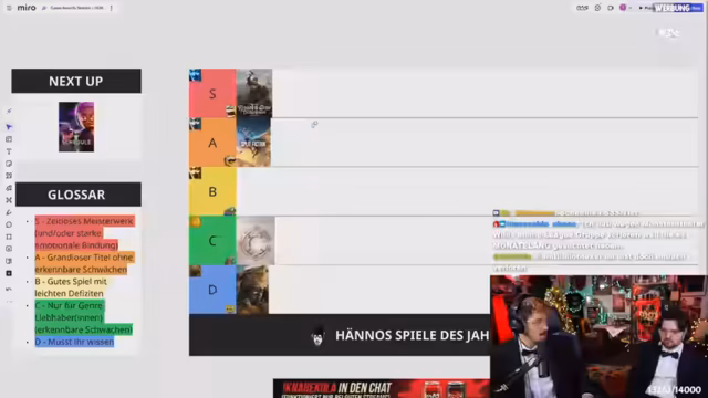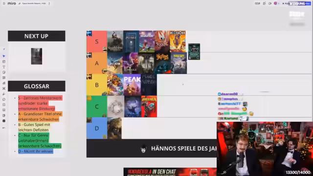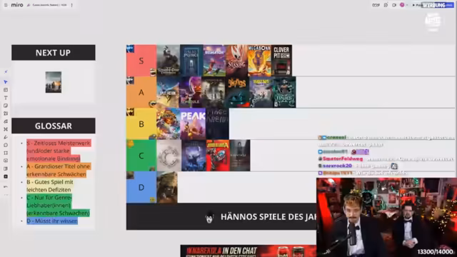 00:14:52Das heutige Programm wird vorgestellt: Reaktion auf Game-Awards-Gewinner, Vorstellung von vier Trailern, Erstellung einer Tierliste der besten Spiele des Jahres und Einbindung von Video-Botschaften eingeladener Experten. Ankündigung eines Hardcore-WoW-Events am nächsten Tag (27.) mit über 200 Teilnehmern auf dem Discord-Server, der bei Papa Platte angekündigt wird.