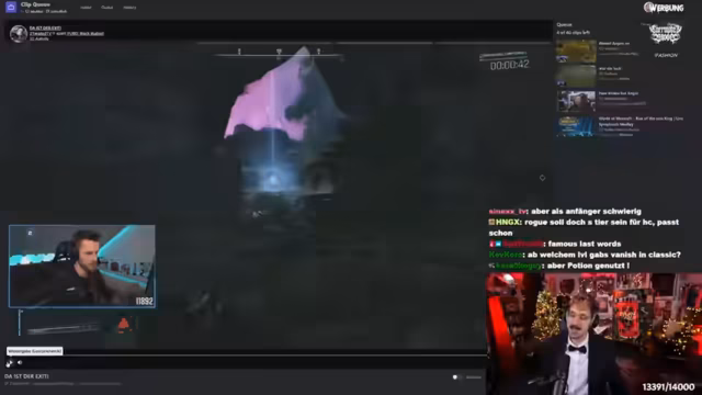 07:45:50Die Community wählt zwischen Allianz und Horde via Twitch-Umfrage – die Ergebnisse sind ausgeglichen. World Buffs sind erlaubt, da viele Spieler neu sind. Anfänger-Tipps werden gegeben (z.B. Videos von Dalukat/Jenyan). Wildcards für Zuschauer sind explizit ausgeschlossen; nur geladene Streamer teilnahmeberechtigt. Keine Interaktion mit Zuschauern im Spiel.