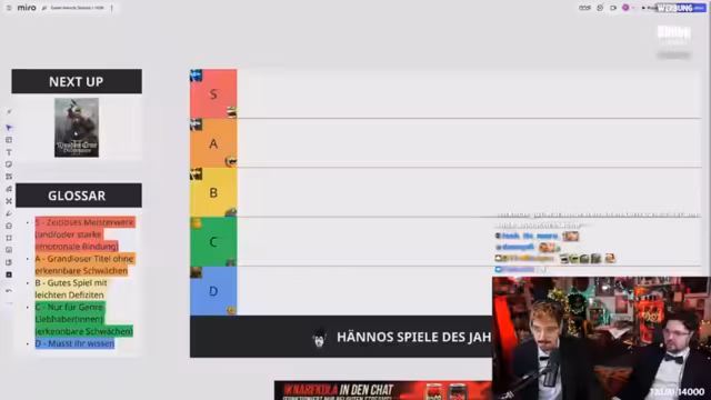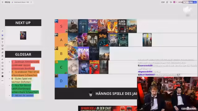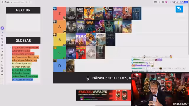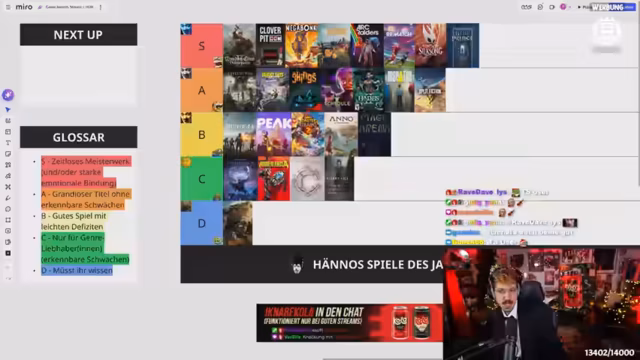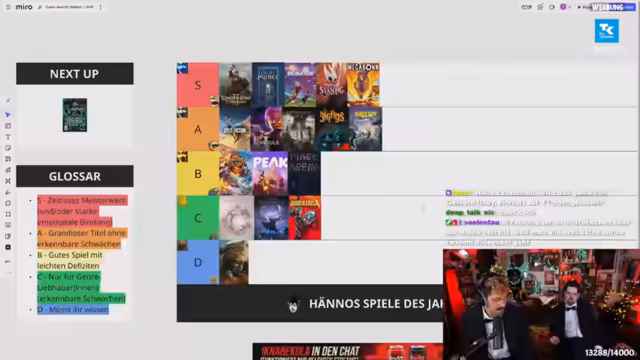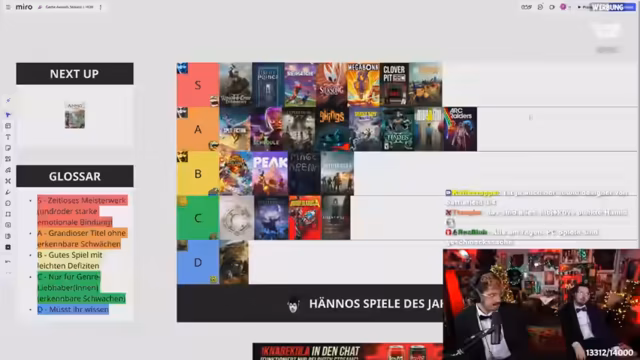 00:53:08Erstellung einer Tierliste der besten Spiele des Jahres. Definition der Rangstufen: S-Tier (zeitlos/Emotion), A bis D. 25 Titel wurden ausgewählt, basierend auf Streamerfahrung, offensichtlichen Top-Games und privaten Vorlieben. Kingdom Come Deliverance 2 wird als erstes Spiel als S-Tier eingestuft, da es trotz Schwächen im Progression-System alle Lieblingselemente vereint. Kritik an der fehlenden Nominierung von KCD2 bei den Game Awards.