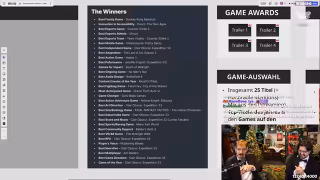 00:20:55Beginn der detaillierten Durchsicht der offiziellen Game-Awards-Gewinner. Claire Obscure Expedition 33 dominiert mit Preisen wie Best Art Direction und Best Score, was Kritik auslöst. Besonders umstritten: Kein Preis für Kingdom Come Deliverance 2 trotz Nominierungen, während Mario Kart World Best Sports Racing Game gewann, was als Frechheit bezeichnet wird. Andere Kategorien wie Best RPG (Claire Obscure statt KCD2) werden ebenfalls diskutiert.