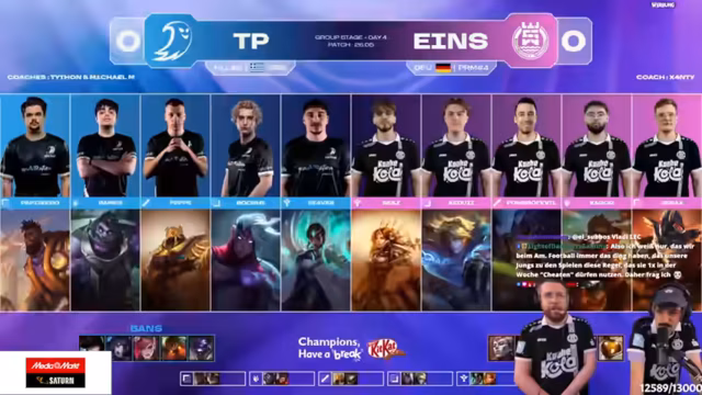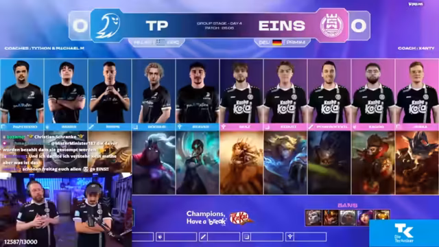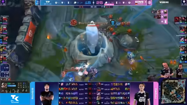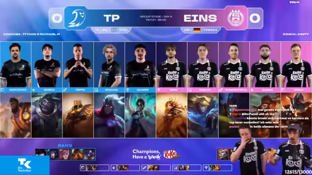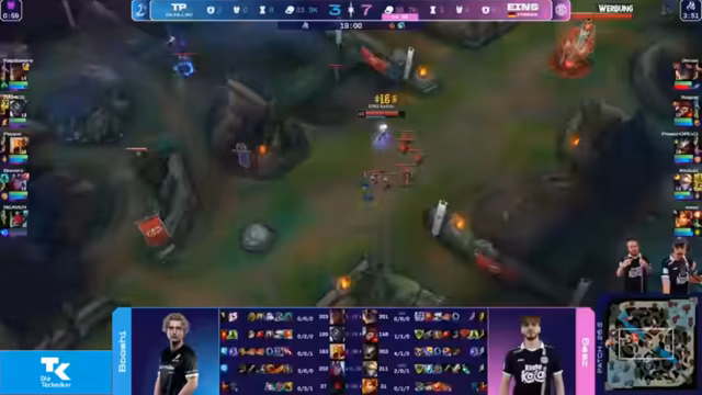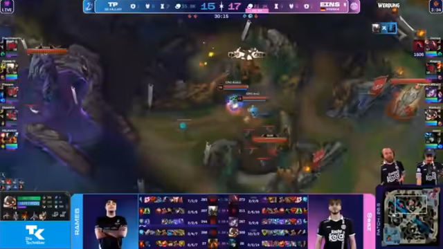 04:02:15Durch erfolgreiches Rotieren und Kontrolle über die Mitte zwingt das eigene Team einen Fight. Die gegnerische reagiert unkoordiniert und misspositioniert, was Eintracht Spandau die Gelegenheit gibt, Tristan stark zu schaden und ihm einen Goldvorteil von 1500 Gold zu entreißen. Die Kommentatoren loben die saubere CC-Kette zwischen den eigenen Engage-Champions Leona und Wukong, die den Fight entscheidend zugunsten von Eintracht Spandau entschieden haben.