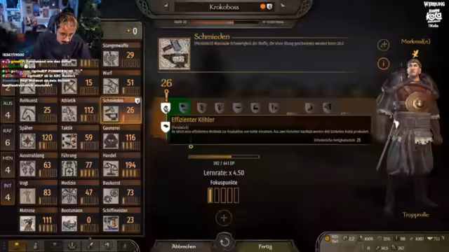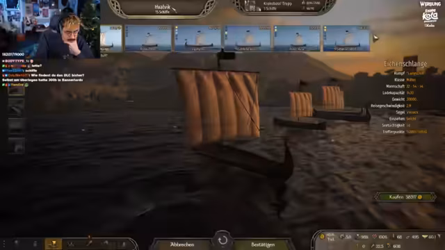 05:28:55Nachdem das neue Schiff, ein 'dicker Kahn', erworben wurde, wird der Fokus auf dessen Ausrüstung und Besatzung gelegt. Der Streamer entscheidet sich für den Kauf einer schweren Eisenballiste, die sehr effektiv gegen gegnerische Besatzungen ist. Ziel ist es, die Besatzungskapazität zu erhöhen und Truppen wie Bogenschützen und Wasserbogenschützen an Bord zu haben. In der ersten großen Seeschlacht gegen Piraten wird das Schiff auf die Probe gestellt, wobei Ballistenfeuer und das Rammen der gegnerischen Schiffe die Haupttaktiken sind. Obwohl einige Truppen verloren gehen, wird der Kampf als gelungen und der Spielmodus als 'saug geil' bezeichnet.