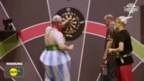 00:37:27Vor dem eigentlichen Turnier findet ein Showmatch statt. Hand of Blood und Dibi treten in voller Rüstung gegen Martin Schindler und einen 'Drachen' an. Für die Profi-Spieler (Hand of Blood, Dibi) besteht das Handicap, dass sie mit 40 Kilogramm Rüstung werfen müssen. Das Spiel endet 301 zu 0 für die PDC-Spieler. Die Rüstung erwies sich als erheblicher Nachteil.