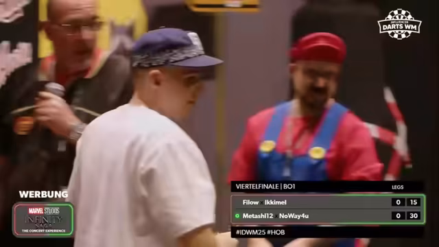 02:12:03Das letzte Viertelfinale startet mit dem Team Crispy Rob und Gnu gegen Milchbaum und Junior. Kommentator Janni teilt seine bewundernden Fanboy-Momente für deutsche Darts-Legenden wie Martin Schindler und Mensur Suljovic. Während des Spiels gibt es zahlreiche Versuche, die Stimmung durch das Werfen von Freibierflaschen an das Publikung zu heizen, was die laute und chaotische Atmosphäre unterstreicht. Crispy Rob und Gnu spielen konzentriert, aber verlieren knapp, nachdem Rob im entscheidenden Moment über eine 5 wirft und seinen Finisher verpasst. Das Publikum ist trotz der Ergebnisse sehr enthusiastisch und wird durch gezielte Ansprache noch mehr加热.