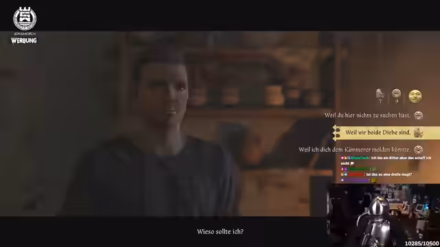02:38:09Der Streamer setzt seine Schleichmission fort, um Thomas zu retten. Er wirft Steine zur Ablenkung der Wachen und versucht, unentdeckt zu bleiben. Es wird über das Symbol mit den roten Beinen im Spiel diskutiert, das anzeigt, dass man verknackt wird, wenn man erwischt wird. Der Streamer erreicht den Jungfernturm und trifft auf Adela. Er erfährt, dass Thomas von Banditen überfallen wurde und der Priester Nicodemus versucht, ihm zu helfen. Der Streamer bietet an, einen Trank für Thomas zu brauen, benötigt aber das medizinische Manuskript des Knochensägers, das sich vermutlich in dessen Gemächern befindet. Es wird über die Gründe für Hans' Verurteilung wegen Wilderei diskutiert und dass Thomas bezeugen muss, dass Hans unschuldig ist.