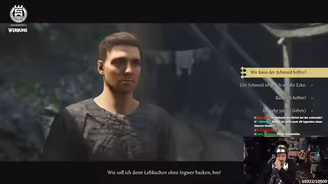 02:24:56Nach dem Wechsel zu 'Kingdom Come: Deliverance 2' beginnt der Streamer eine neue Mission. Er muss eine Axt für einen Freund namens Hans schleifen, der wegen Wilderei hingerichtet werden soll. Nachdem er den Schleifstein in der Schmiede gefunden hat und die Axt schärft, sieht er sich mit einem moralischen Dilemma konfrontiert. Die Mission führt ihn in die Burg, wo er unauffällig agieren muss, um den Freund zu retten, und mit dem Problem umgeht, wie er in das Jungfrauzimmer gelangen kann.