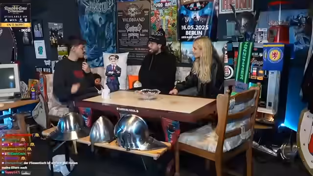 00:18:28Handofblood klärt zunächst Postproduktionsdetails und begrüßt die Zuschauer. Er präsentiert einen neuen Helm und stellt fest, dass er stark riecht, möglicherweise durch Tierfett. Es wird über den Preis des Helms diskutiert (240 Euro) und dass noch Polsterung fehlt. Er zeigt auch bestellte Schulterteile einer Rüstung, bei denen das mittlere Teil fehlt. Handofblood erklärt, dass die Schulterteile angeklemmt werden müssen und der Helm darauf liegen soll, um besser zu sitzen. Es wird kurz über die Lautstärke des Sub-Sounds gesprochen und Anpassungen vorgenommen.
