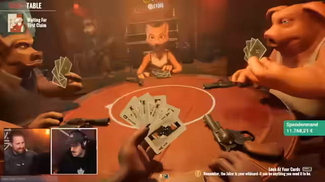 00:57:05Die Testrunde von Liar's Dice beginnt mit einer humorvollen Begrüßung. Die Teilnehmer erkunden das Spielinterface und stellen fest, dass man sich umgucken und emoten kann. Niklas wird aufgrund seines Avatars verspottet. Es wird festgestellt, dass das Mikrofon im Spiel aktiviert ist. Die ersten Spielzüge werden gemacht, wobei es darum geht, Könige zu legen. Niklas wird des Lügens bezichtigt, was sich jedoch als falsch herausstellt. Es gibt weitere Erklärungen zum Spielprinzip, wobei betont wird, dass man die Karten auswählen und legen muss. Die Teilnehmer versuchen, das Spiel zu verstehen und die Strategien der anderen zu durchschauen. Es wird erklärt, dass man immer die gleichen Karten legen muss und dass oben links angezeigt wird, welche Karten gerade im Spiel sind. Die Runde wird genutzt, um die Regeln zu verinnerlichen und sich mit dem Spielablauf vertraut zu machen.
