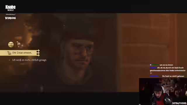 03:46:30In der Kneipe versammeln sich die Protagonisten für das bevorstehende Duell. Menhard erklärt die Regeln und den Hintergrund des Kampfes. Der Streamer muss als Heinrich in die Kuttenberger Bruderschaft aufgenommen werden, um den Kampf antreten zu dürfen. Dazu muss er einen Eid schwören und seine Fähigkeiten unter Beweis stellen. Menhard betont, dass der Sieg die einzige Möglichkeit ist, ihre Ehre wiederherzustellen. Der Streamer äußert seine Bedenken bezüglich der Ungerechtigkeit des Kampfes, da die Gegner leichte Rüstung tragen, während sein Charakter im Gambison kämpfen muss. Trotzdem willigt er als Heinrich in den Eid ein.