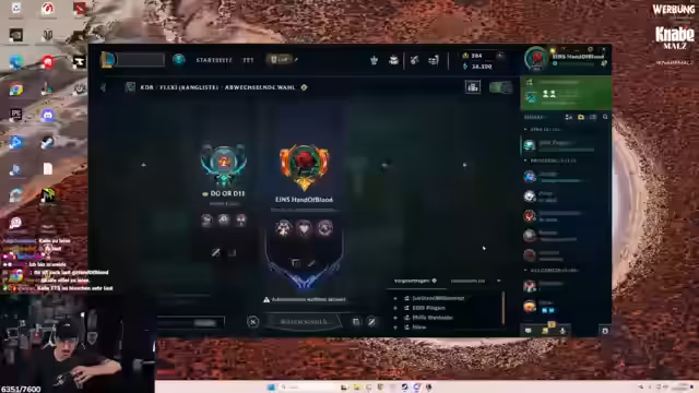 03:15:39Die Spieler organisieren sich für FlexQ-Spiele in League of Legends und besprechen mögliche Teamkonstellationen. Es werden verschiedene Accounts und Ränge diskutiert, während versucht wird, die besten Spieler für das Team zu rekrutieren. Die Kommunikation läuft über Discord, während die Spieler nach Wegen suchen, ihre Fähigkeiten gemeinsam zu verbessern.