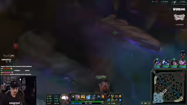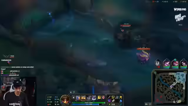 04:57:10Im ersten Ranked-Spiel trifft der Streamer auf einen Warwick als Top-Laner. Er entscheidet sich für Lethal Tempo, obwohl er später vermerkt, dass Grasp vielleicht besser gewesen wäre. Das Spiel startet schlecht, da Warwick aggressiv handelt und den Streamer unter Druck setzt. Trotz Item-Vorteil (Trinity Force) verliert die Lane, und der Streamer beschreibt das Matchup als schwierig, da Warwick früh starke Combos hat und viel Schaden verursacht.