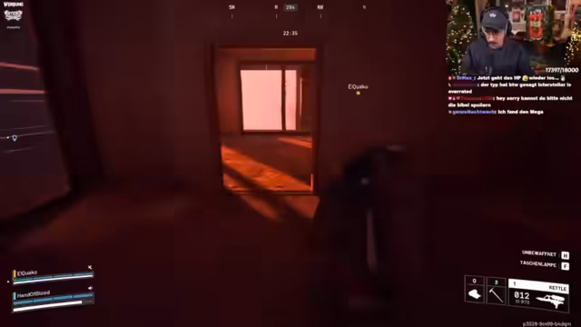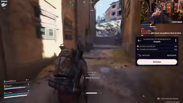 05:27:04Das Team kämpft gegen feindliche Maschinen und andere Spieler. Die Kommunikation ist intensiv und hektisch. Der Streamer versucht, mit Hilfe von Smokes und Granaten in gute Positionen zu kommen, ger aber in Schwierigkeiten, als er angegriffen wird. Teamkollegen wie Danny und Carsten leisten Deckung und versuchen, ihn zu retten. Es ist ein wildes Gefecht, in dem das Team seine taktische Koordination unter Beweis stellt.