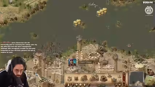 04:06:48Der Streamer beginnt eine neue Mission aus der Kreuzzug-Kampagne, die als deutlich schwerer beschrieben wird. Ziel ist es, die Burg von Saladin einzunehmen. Die Anfangsphase ist kritisch, da die Ressourcen knapp sind und der Fokus auf der Erzgewinnung und Verteidigung liegt. Der Gegner Saladin wird als sehr aggressiv und expansionsfreudig beschrieben, der schnell starke Verteidigungsanlagen baut. Der Streamer experimentiert mit verschiedenen Taktiken, wie dem Bau von Rüstungsschmieden und dem Verkauf von Gütern, um Gold zu generieren und Truppen zu rekrutieren.