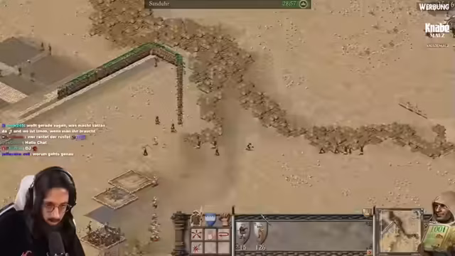 05:56:44Der Streamer beginnt mit einer weiteren Kreuzzug-Mission, die er als theoretisch einfach, aber zeitaufwendig beschreibt. Es kommt zu anfänglichen Schwierigkeiten mit Ressourcen wie Holz und Stein sowie zu unerwarteten Angriffen, die zu einem chaotischen Spielstil führen. Der Streamer wirkt frustriert über die 'Hyänen', die seine Arbeiter töten, und bemängelt, dass seine Bauarbeiter aus unerklärlichen Gründen ihre Arbeit einstellen. Die Mission erweist sich als herausfordernd, da er mehrere Gegner in unter einer Stunde eliminieren muss, wobei die Zeitverwaltung und Ressourcenknappheit zentrale Probleme darstellen.