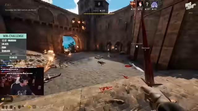 03:51:52Das Spiel wird zunehmend fordernd. Die Gegner werden stärker und erscheinen in größeren Gruppen. Die Streamer sterben vermehrt und haben Müden, den Adel zu verteidigen. Es kommt zu Diskussionen über die Wahl der Waffen und die Taktik. Ein Streamer fühlt sich durch die Wahl der Armbrust im Vorteil. Am Ende stellen fest, dass sie mit nur drei Spielern die Challenge vermutlich nicht meistern werden, da sie mit zu wenigen Leuten starten. Trotzdem bleibt die Stimmung gut und der Versuch wird bis zum Ende weiterverfolgt.