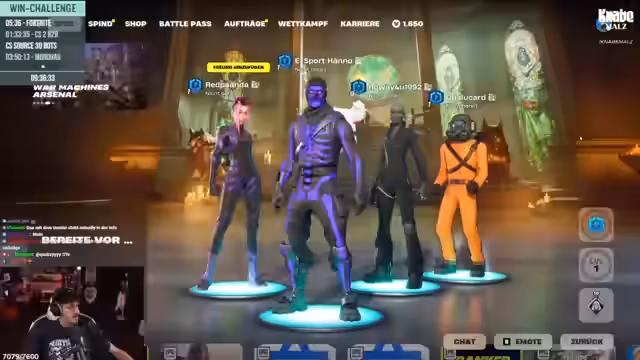 10:33:16Nach dem erfolgreichen League of Legends-Spiel wechselt das Team zu Fortnite. Die Stimmung ist enthusiastisch, man freut sich auf das neue Spiel. Man bespricht die Items und Spielmechaniken, insbesondere die neuen Ballons, die einem einen Höhenboost geben. Es wird versucht, eine gute Landezone zu finden und sich mit Loot auszustatten, um eine Runde zu gewinnen.