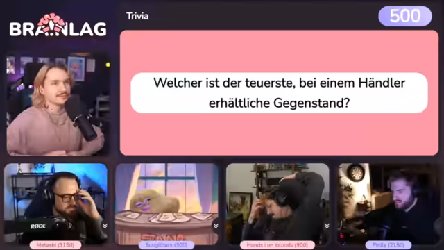 02:55:42Die Quizrunde wechselt zu einem Sound-Quiz für hohe Punkte. Streamer spielt einen WoW-Sound ab und die Teilnehmer müssen erraten, worum es sich handelt. Für 600 Punkte ist die Frage nach einem Geräusch für die Unterwasseratmung. Teilnehmer Philly erkennt den Sound sofort als 'ertrinken' und gewinnt die Punkte. Streamer erklärt, dass es sich um einen Alchemie-Trank handelt und bewundert die schnelle Reaktionsfähigkeit von Philly.