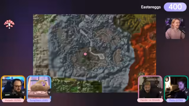 02:41:07Nachdem die technischen Hürden genommen sind, beginnt die erste Runde des Zielpunkt-Spiels. Streamer zeigt ein Bild eines Ortes und die Teilnehmer müssen diesen auf der interaktiven Karte finden. Gewinner ist der, dessen Pin am nächsten am gesuchten Ort liegt. In der ersten Runde landet die Mehrheit der Teilnehmer in den östlichen Königreichen, während der gesuchte Ort in den östlichen Pestländern liegt. Trotz falscher Annahmen wird der Ablauf als Testrunde und Übung gewertet.