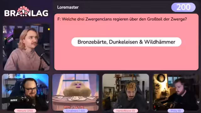 02:30:59Das Quiz beginnt mit einer ersten Frage über die drei Zwergenclans. Obwohl als einfach eingestuft, gibt es Schwierigkeiten bei der Antwort, und es kommt zu Diskussionen über die Bewertung. Die Teilnehmer müssen durch Buzzern antworten, was zu ersten Minuspunkten führt. Die Dynamik ist chaotisch, und der Streamer versucht, die Regeln klarzulegen und das Quiz fair zu gestalten.