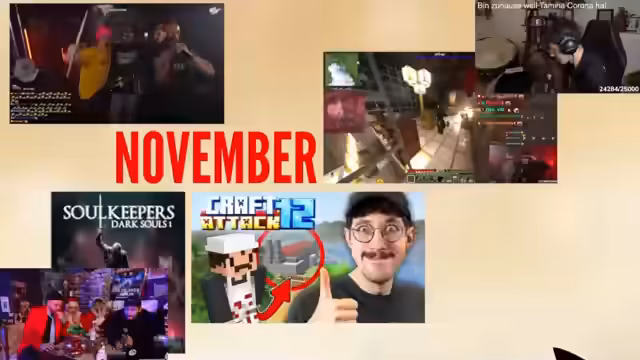 03:39:11Der November stand im Zeichen von Minecraft, Craft Attack und insbesondere Techno-Friday. Ein absolutes Highlight des gesamten Jahres war der Auftritt von Saya Yona im Techno-Friday-Stream. Auch gab es eine Premiere mit Kroko, bei der John Fick vorgestellt wurde. Der Streamer nutzt den Zeitpunkt, um den bisherigen Jahresrückblick zusammenzufassen und bedankt sich bei seinem Team und der Community für das vergangene Jahr.