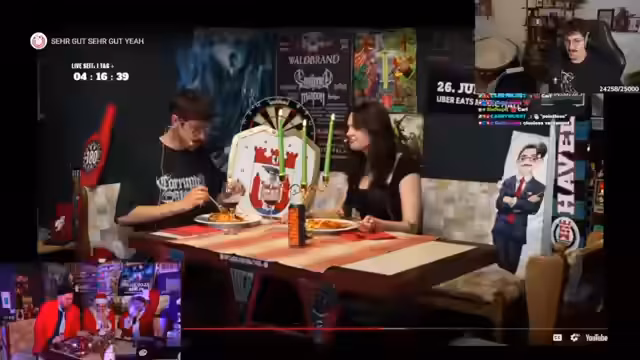 03:23:19Ein absolutes Highlight im Oktober war die 'ultimative Win-Challenge' mit dem Streamer Kroko. Ein besonders lustiger Moment entstand, als Kukus beim Versuch, eine Pizza zu bestellen, stockte und diese doch tatsächlich ankam. Dieser Moment sorgte im Chat kollektiv für 'Kokoslache'. Die Challenge diente als Bonding-Event, da sich die beiden zuvor kaum kannten und sich bei den Stream Awards wiedertrafen. Weitere Highlights an diesem Wochenende waren eine Mario-Party-Session und ein Kartenhaus-Bau.