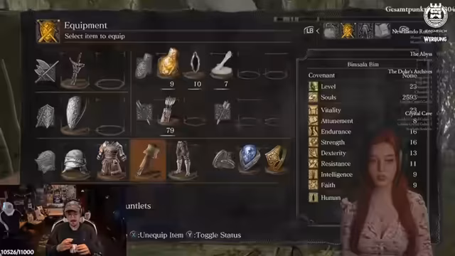 02:21:50Der Streamer plant den nächsten Teil des gemeinsamen Soulkeepers-Spiels, einer Dark Souls-Serie. Zunächst ist eine Entscheidung über den Spielstil zu treffen: Soll es ein tryhard-angetriebener Meta-Build oder ein Spaß-Build für das Gameplay sein? Nach einer anfänglichen Erwägung der Claymore wird eine Entscheidung für den Zweihänder als Waffe getroffen. Dies leitet in eine strategische Diskussion über den weiteren Spielverlauf und das Vorgehen bei bereits besiegten Gegnern über. Der Fokus liegt auf der Nutzung von Know-how und Erfahrung, um die Herausforderung meistern zu können.