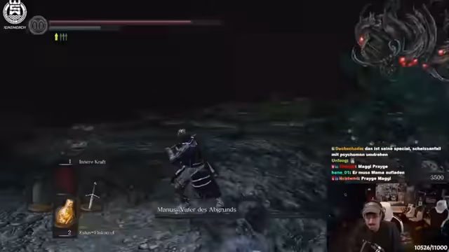 04:36:59Der Streamer beschäftigt sich intensiv mit dem Bosskampf gegen Manus. Er erwähnt seine hohe Punktzahl von 50 und die Absicht, sterben zu müssen, um den Kampf mehrmals üben zu können. Er beschreibt die Schwierigkeit von Manuss Attacken, insbesondere der Grapple- und Magie-Attacken. Es wird die Notwendigkeit betont, die Angriffsmuster genau zu kennen und richtig zu dodgen. Besondere Aufmerksamkeit gilt der Seltsamen Rüstung mit erhöhtem Poise, die es ermöglicht, mehr Treffer auszuhalten.