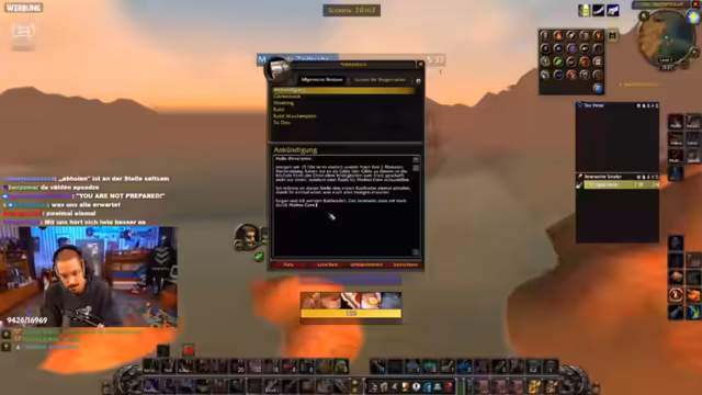 00:12:26Der Streamer wechselt das Thema und begrüßt seine Zuschauer mit einem entspannten 'Hallo Freunde'. Er geht auf den bevorstehenden Molten Core Raid am nächsten Tag ein und erwähnt, dass er selbst gerade beim Bäcker war. Die Stimmung wandelt sich von der anfänglichen Aggression zu einer enthusiastischen Vorbereitung auf den anstehenden World of Warcraft Raid, bei dem er auch seine persönlichen und strategischen Pläne für den Raid skizziert.