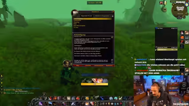 04:42:35Der Streamer erzählt von seiner Verletzung, einem gebrochenen Arm im Alter von 12 Jahren, und von seinen Erfahrungen beim Einloggen und der Gruppe in World of Warcraft. Er erwähnt auch, dass niemand mit ihm gesprochen habe. Es werden Vorbereitungen für einen Raid mit den Namen Chef Strobe und Rumatra angesprochen, und über die Ausrüstung des Spielers Matra gesprochen. Des Weiteren wird eine Idee für einen Vergleich zwischen Zul'Gurub und Molten Core-Raid mit 20 Leuten in zwei Gruppen diskutiert, was als sehr geil bezeichnet wird.