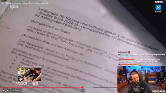 00:58:03Der Stream schaltet zu einer Reaktion auf eine NDR-Dokumentation über Schulverweigerer. Er kommentiert die Situation des Jugendlichen David, der Probleme mit der Schule hat, und seiner alleinerziehenden Mutter Anne-Dore, die finanzielle Sorgen hat und Hartz IV bezieht. Der Streamer diskutiert die sozialen Hintergründe, die Schulpolitik und die moralischen Dilemmata der Protagonisten, wobei er persönliche Einblicke in seine eigene Schulzeit gibt und die psychische Belastung der Mutter schildert.