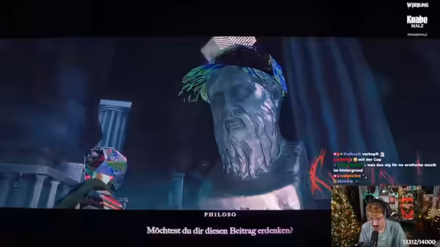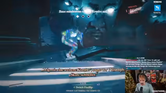 01:46:33Der Streamer entdeckt ein Spiel mit customizing-Optionen, das maßgeschneiderte Geschenke laut Amtsunterlagen anbietet. Als Währung werden Seelen genutzt, die durch Skateboard-Tricks verdient werden müssen. Das Spiel enthält Horcruxe aus Harry Potter, die Teile der Seele speichern. Der Philosoph im Spiel stellt Fragen zu Tricks und Combos, die der Streamer beantworten muss, um kosmische Bestrebungen wie den Mondverschling zu erfüllen. Die Atmosphäre wird als audiovisuell beeindruckend beschrieben, unterstützt durch düstere Musik.
