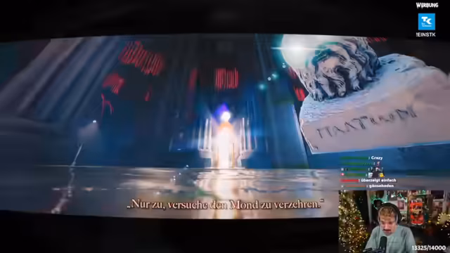 02:00:46Der Streamer nimmt das Versprechen des Philosophen an und versucht verzweifelt, den Mond zu verschlingen. Nach mehreren missglückten Versuchen gelingt es ihm schließlich, den Mond mit einem trickreichen Finisher zu bezwingen. Beim Verspeisen des Mondes stellt er fest, dass er nach Kreide und Felsen schmeckt. Unmittelbar danach fällt der Streamer in einen tiefen Schlaf, während sieben neue Monde am Himmel erscheinen und das Kapitel des spielerischen Erlebnisses abschließt.