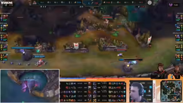03:31:18Der Stream wechselt in eine Live-Kommentierung des laufenden Spiels. Die eigene Mannschaft, Eintracht Spandau, startet mit einem Goldvorteil. Ein zentrales Thema ist die aggressive Top-Lane-Strategie von Tristan, die einen Turm ergibt, aber Gold generiert und Druck aufbaut. Im Teamfight wird die eigene Frontline als stark positioniert beschrieben. Allerdings erleidet das Team einen Rückschlag, als es in einem Teamfight abgeholzt wird und den Pantheon-Fokus verpasst. Trotzdem wird die Kontrolle über wichtige Objectives wie den Drachen beibehalten, und der strategische Vorteil bleibt bestehen, da die Spielrichtung weiterhin vom Team bestimmt wird.
