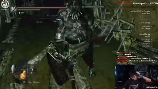 00:40:11Ein Highlight des Streams ist eine besondere Wette, die der Streamer mit Matteo abgeschlossen hat. Sollte Edo P. in seinem ersten Versuch mehr Punkte als Donny erreichen, würde sich Matteo ein 'E' in den Nacken rasiern. Dies wurde von Matteo jedoch abgelehnt. Außerdem werden verschiedene Clips aus den Dark Souls Runs gezeigt und analysiert. Besonders eine verrückte Situation, bei der ein Spieler nach einem scheinbaren Tod sofort reagiert und den Boss besiegt, sorgt für Aufsehen und wird als 'insane' und 'crazy' beschrieben.