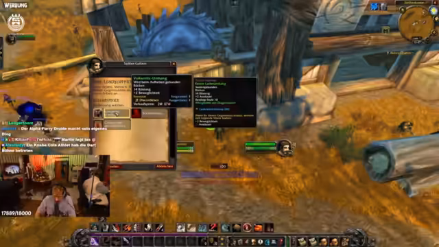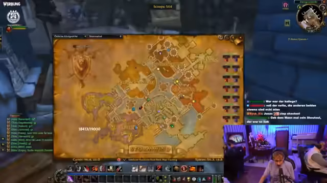 05:39:14Die Gruppe bewegt sich nach Sturmwind, um dort Geschäfte zu tätigen und das Crafting voranzutreiben. Ein Spieler möchte vom Schurkenlehrer neue Fähigkeiten lernen. Die Planung für den Auktionshausbesuch und das gegenseitige Einladen in die Gilde ist ein wichtiges Thema. Der Streamer organisiert den Transport von Rohstoffen, um Stoff für das Herstellen von Taschen zu besorgen, und bittet um Unterstützung von Gildenmitgliedern.