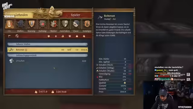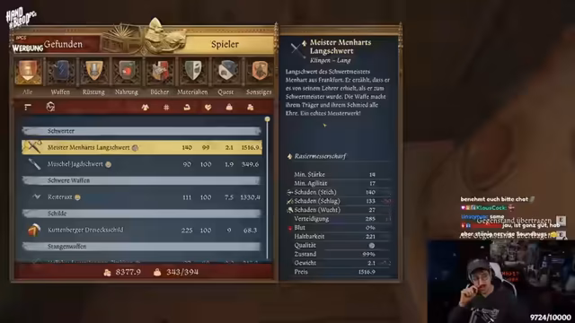 03:04:45Der Streamer meldet sich für ein Schwertkampfturnier in Kuttenberg an, das in drei Disziplinen stattfindet: Schwert und Schild, Langschwert und freier Kampf. Er erhält Rüstung und Waffen vom Turnierleiter und gewinnt seine Kämpfe gegen Harald den Humpenheld und Lorenz den Steinhauer. Der Streamer äußert seine Freude über die Teilnahme und den Sieg, obwohl er sich über die Qualität der Gegner und die turniereigenen Regeln amüsiert zeigt. Schließlich kehrt er zu seiner normalen Kleidung zurück und beschwert sich über die umständliche Rückabwicklung der Turnierausrüstung.