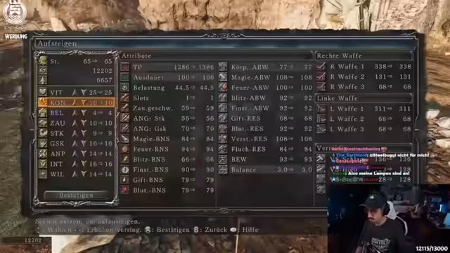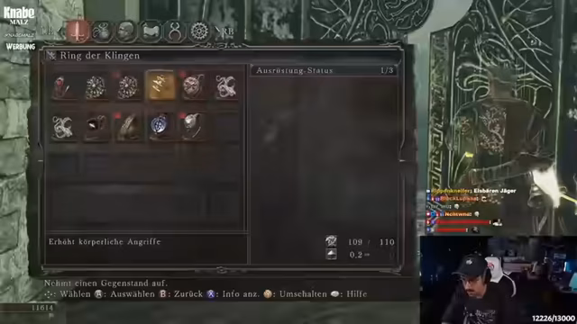 02:28:51Der Streamer nutzt die gesammelten Seelen, um seine Waffen weiter zu verbessern, und besorgt den Ring des Beschützers von einem Boss, um den Schaden bei Parade zu erhöhen. Anschließend wird eine strategische Pause eingelegt, um sich auf den nächsten Bereich, Jägerhain, vorzubereiten. Man entscheidet, einen Boss zu überspringen, um später zurückzukehren. Der Run wird mit dem Ziel fortgesetzt, alle DLC-Bosse zu besiegen, wenn möglich, und der Controller wird als defekt bemängelt.