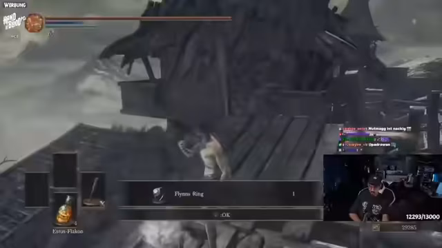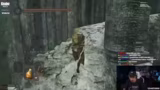 01:17:43Unmittelbar nach dem Run-Start wird der Streamer mit ersten kritischen Situationen konfrontiert. Eine knifflige Plattform am Anfang des Spiels erfordert präzise Schrittanzahl, um in den Abgrund zu fallen, ohne zu sterben. Dies gelingt nur knapp, was den Run direkt anspruchsvoll macht. Anschließend kämpft er gegen den Drachenräuber, dessen Attacken gefährlich sind. Der Streamer erklärt wichtige Spielmechaniken wie die Ausdauer und das Einsammeln von Seelen. Das Spiel, insbesondere die Bosskämpfe, wird als sehr laut im Vergleich zur Stimme des Streamers wahrgenommen.