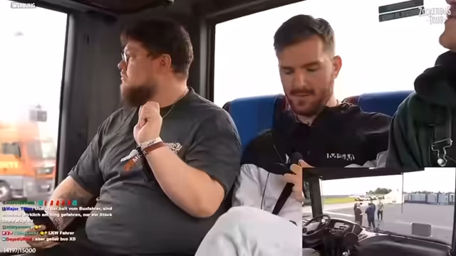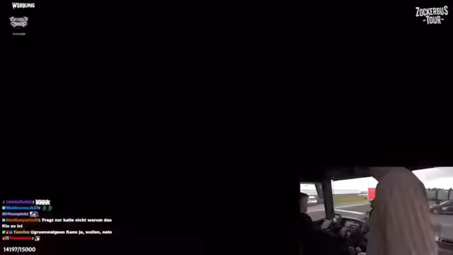 04:00:40Nach dem Konflikt um das Fahren des Busses wird die Stimmung wieder lockerer. Der Bus fährt nun in verkehrter Richtung über die Rennstrecke, was als besondere Erfahrung beschrieben wird. Ein Highlight ist die Interaktion mit einem LKW-Fahrer. Auf Bitten des Streams scannt er erfolgreich einen QR-Code und hupt zum Zeichen der Anerkennung, was als 'gänsehafte' und 'stream award worthy'-Moment gefeiert wird und die positive Stimmung unterstreicht.