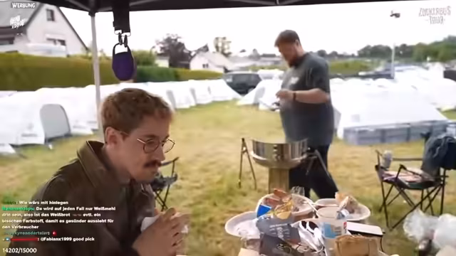 08:37:20Der Streamer aktiviert den Chat und fragt nach den beliebtesten Gerichten und Produkten für den Grill. Es kommt eine Fülle von Vorschlägen, von Rippchen über Schaschlik bis hin zu Grillkäse und süßen Optionen wie Marshmallows. Die Diskussion weitet sich aus zu persönlichen Anekdoten, wie Erinnerungen an Stockbrot oder Brezeln von Klassenfahrten. Gleichzeitig wird ein eye-catcher bemerkt, als die Feuerwehr vorbeifährt, was für einen kurzen Aufschrei sorgt und die Reality des Camping-Setups unterstreicht.