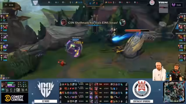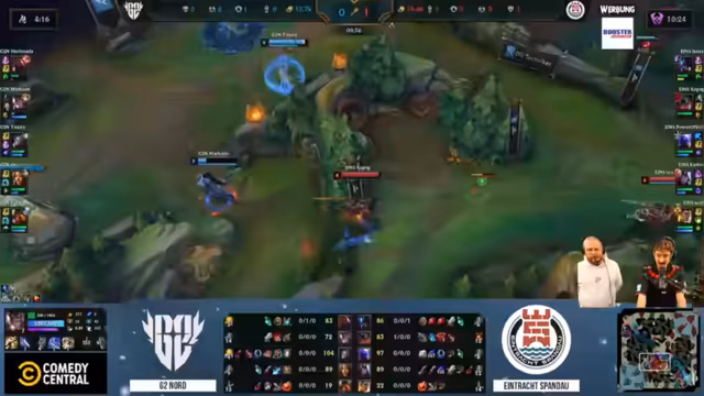 05:17:13Das Spiel startet mit der Hymne 'Spandau, Spandau, wir lieben dir' und geht in die entscheidende Phase. Das Poppy-Support-Pick von G2 wird als starker Counter gegen die eigene Alistar-Botlane identifiziert. Trotzdem kann ein较早er Teamfight erfolgreich gewonnen und der erste Drache gesichert werden. Nach einem schwierigen Mid-Lane-Fehler, der zu einem langen Rückstand führt, kämpft sich das Team mit einem erfolgreichen Baron-Rückgewinn und dem anschließenden Gewinn eines Teamfights zurück ins Spiel, was die starke Comeback-Mechanik und die Effektivität der Catch-Kompensation zeigt.