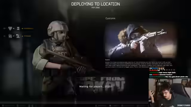 05:12:16Nach einer Runde, die vorzeitig beendet wurde, da der Streamer nicht die erforderliche Zeit im Spiel verbracht hatte, unterhält er sich mit Kalle über das Spiel Escape from Tarkov. Sie diskutieren die Einarbeitung in das Spiel, die steile Lernkurve und den Unterschied zwischen der Performance von damals und heute. Der Streamer lobt die verbesserte Performance und Soundtechnik und gibt eine Einschätzung ab, wie sich Kalle in das Spiel eindenken könnte, sowohl als agressiver Spieler als auch als schützender Sniper.