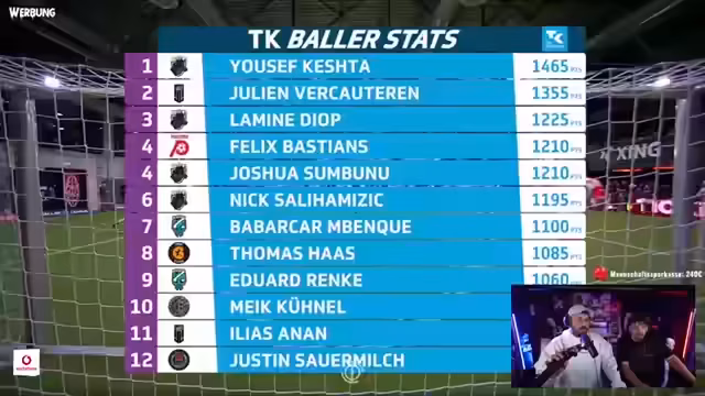 01:59:41Nach einer Pause werden die Ergebnisse der 1v1-Challenges vorgestellt. Für Spandau spielte Kerem Şengün, der aber ausschied. Max Kruse gewann seine Runde. Anschließend präsentiert der Streamer neue Schuhe, die von Partnern zur Verfügung gestellt wurden. Die Adidas Schuhe im "Butter weich wie Honig"-Design werden objektiv bewertet. Die Schuhe werden an Bilal und Tim verteilt, und der Streamer wirbt um die Community-Abstimmung, um zu gewinnen.