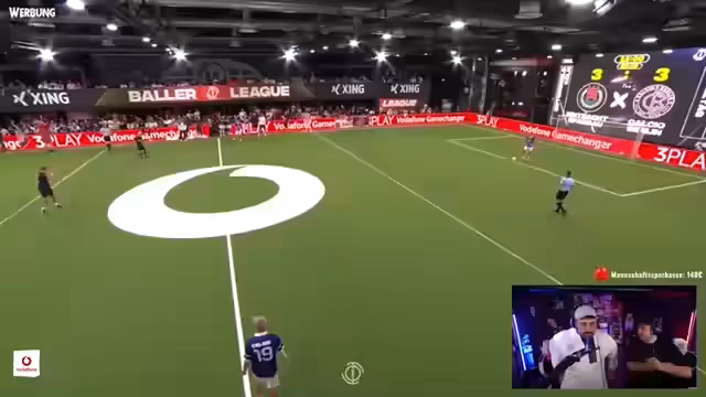 00:56:53Splashbruddaa macht seinen spektakulären Eintritt mit John-Cena-Musik und Wrestling-Gesten. Er übernimmt die Moderation der Pre-Show für die Baller League. Es werden die taktischen Rollen der Streamer definiert: Carl fungiert als Experte, während der Hauptkommentator die Spielereignisse beschreibt. Die Diskussion um die Dartscheibe wird zugunsten des sportlichen Events beendet. Ein Fokus liegt darauf, das Publikum auf das bevorstehende Spiel einzustimmen und die Spannung zu erhöhen.