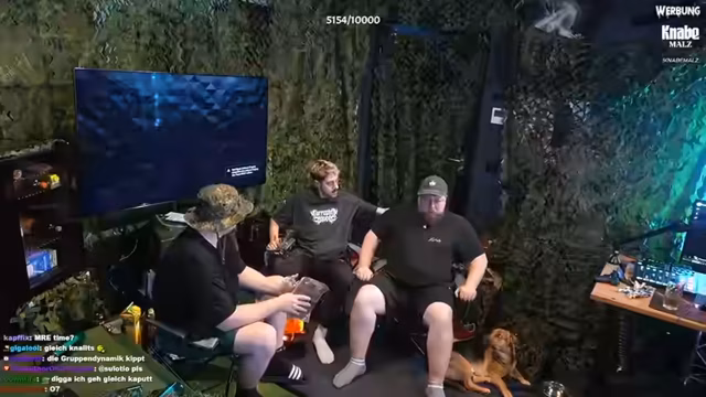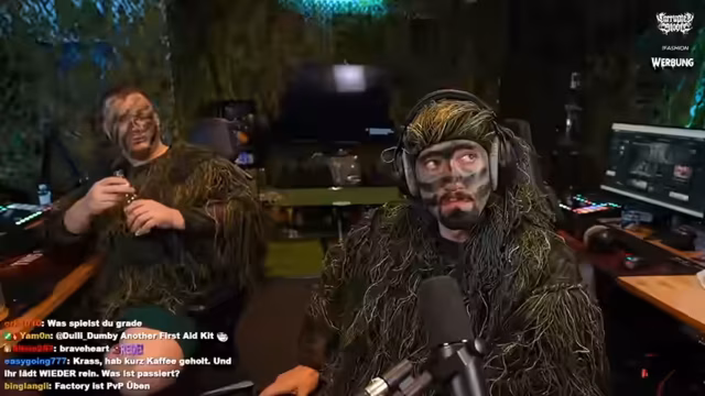 09:05:57Die Szene wechselt zur Vorbereitung auf den nächsten Einsatz. Kalle bemerkt den 'Wind' und beschreibt die Positionierung für einen Überfall. Anschließend geht es in eine surreale Phase, in der die Streamer sich wie in einem Vietnamkrieg-Film 'schminken'. Es werden bunte Gesichtsbemalungen und exotische Bärte diskutiert, wobei ein humorvoller 'Vietnam'-Look favorisiert wird. Während der Aktion hört einer Geräusche und muss die Konzentration auf das Gameplay zurücklenken.