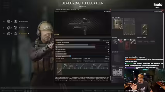 11:10:14Zu Beginn des Streams wird über die Serverauswahl für Maximilian gesprochen, der sich erfolglos bemüht, auf den EU-Server zu gelangen. Anschließend wird der Fokus auf die Spielmodi wie Factory gelegt. Der Streamer äußert seine Begeisterung für die Map, insbesondere im Scaf-Modus, da man häufig nahe dem Exit spawnt. Er erklärt die Mechanik des 'Instant Extracting', das möglich ist, wenn nach mindestens sieben Minuten Restzeit auf der Map noch mindestens 13 Minuten Raid-Zeit verbleiben. Des Weiteren wird die Stärke der Uzi im Detail analysiert, wobei ihre hohe Feuerrate den Vorteil bietet, gegnerische Panzerung durch den massiven Munitionsverbrauch zu schwächen, auch wenn die Durchschlagskraft gering ist.