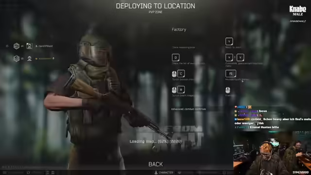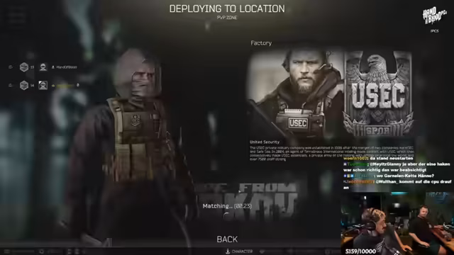 10:25:47Nachdem auf Reserve kein Match zustande kam, wechselt das Team zur Map Factory, um dort spezielle Quests zu erfüllen. Es werden Strategien besprochen, die speziell auf Factory zugeschnitten sind, wie z.B. das Campen am Exit mit einer Pistole oder das gezielte Töten von NPCs namens Tagila. Der Streamer hat sich eine spezielle Waffe, die PP19, mit grünen Leuchtspuren gebaut, um besonders effizient zu agieren. Der Fokus liegt darauf, mit wenig Risiko Ausrüstung zu looten und Quests zu erledigen, um den Charakter weiterzuentwickeln.