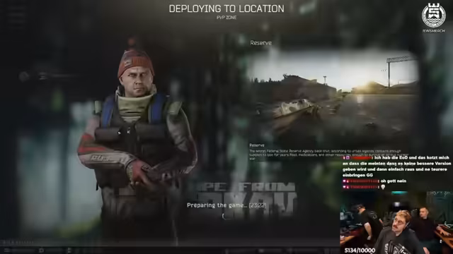 09:57:59Anfangs wird über ein fehlgeschlagenes Ausrüstungs-Spawn gesprochen, bei dem wichtige Gegenstände nicht gesichert werden konnten. Man beschließt, ins Spiel auf der Map Reserve zu wechseln, um spezielle NPCs namens Raider zu jagen. Diese Gegner sind besser ausgerüstet und bieten bessere Beute, was besonders nach einem Wipe im Spiel wichtig ist. Nach dem Matchmaking wird die Map Reserve erklärt, wobei der Fokus darauf liegt, bestimmte Gebäude zu meiden, in denen der Bossggegner Kluha spawnen kann.