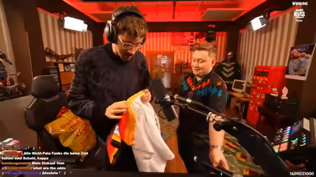 01:46:17Ein Highlight des Streams war das unangekündigte Erscheinen des deutschen Dart-Stars Martin Schindler, der im Netto getroffen wurde und spontan im Stream auftauchte. Die Unterhaltung drehte sich um Schindlers beeindruckende Karriere, seine neun Darter und seine Tätigkeit als Kommentator. Besonderes Augenmerk lag auf seinem exklusiven, nicht käuflichen Trikot von der Dart-WM, das er dem Streamer signierte und dessen Einzigartigkeit betonte.